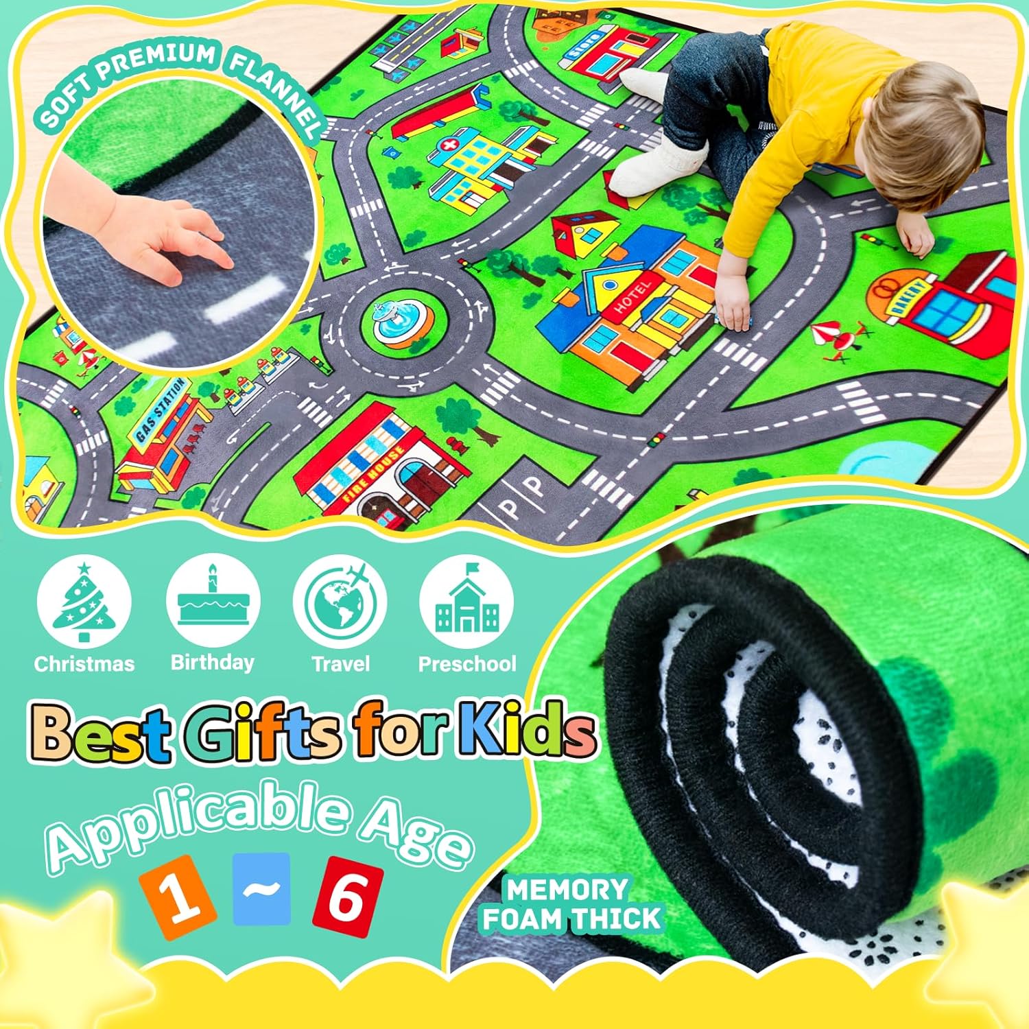 - [Unique Design]This city road rug is the traffic system car mat for kids toy cars,making it perfect for children who enjoy playing with cars,trucks,or fire trucks.The realistic color matching allows your children to have a better outdoor experience indoors