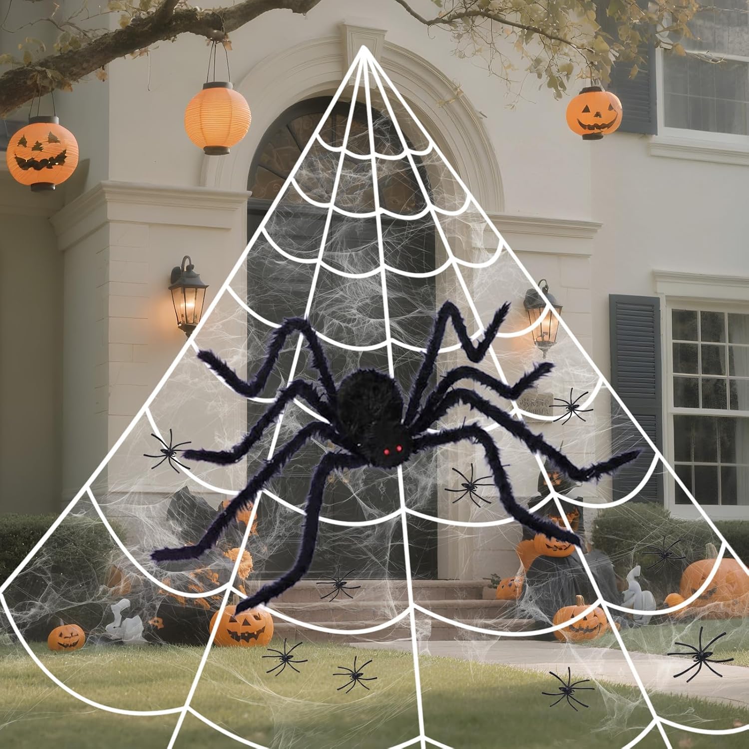 16.4 X 15.8Ft Giant Spider Web Halloween Decorations with 250 LED Lights, Halloween Spider Web Outdoor with 5Ft Large Spider, 3.53 Oz Stretch Web and 20 Small Spiders for Yard House Party Decoration