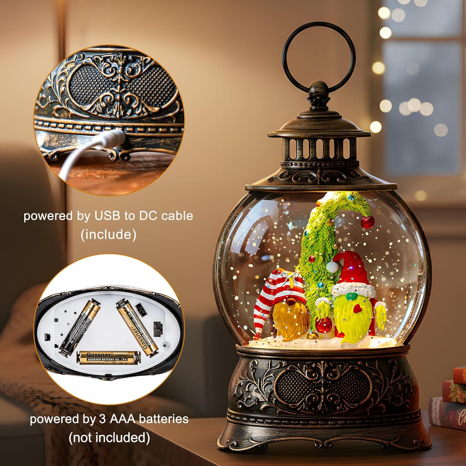 Christmas Snow Globes Christmas Water Lantern with Gnome Wearing Christmas Hats, Music & 6H Timer, USB Lined/Battery Operated Lighted Lanterns for Xmas Festival Decoration Gifts