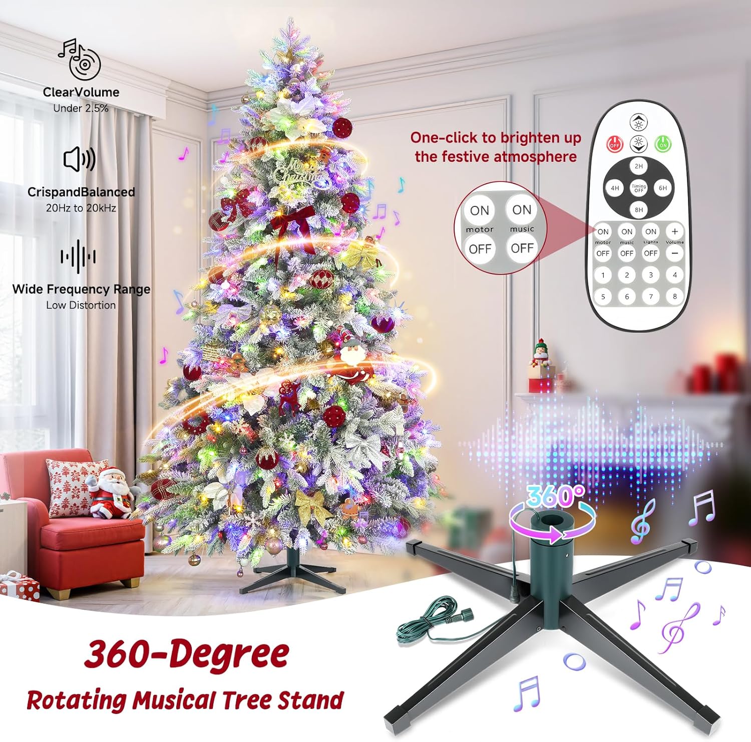 - Remote-Controlled Rotation & Lights: Motorized 360° rotating stand showcases the tree evenly. Choose from 10 lighting modes (RGB + Warm White) via remote for dynamic holiday ambiance