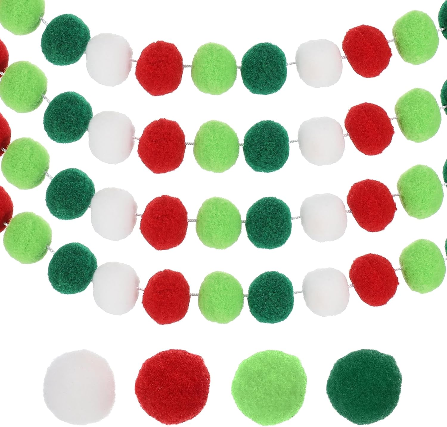 - Specification: Color: Red/Green/White/Gray Green; Material: Polyester, Cotton; Total Length: 8m/26.3Yards(2m each pcs); Pompoms Diameter:2.5cm/0.98Inch; Packing List: 4Pcs x Pom Pom Garland Decorations(Each string of 30 balls)