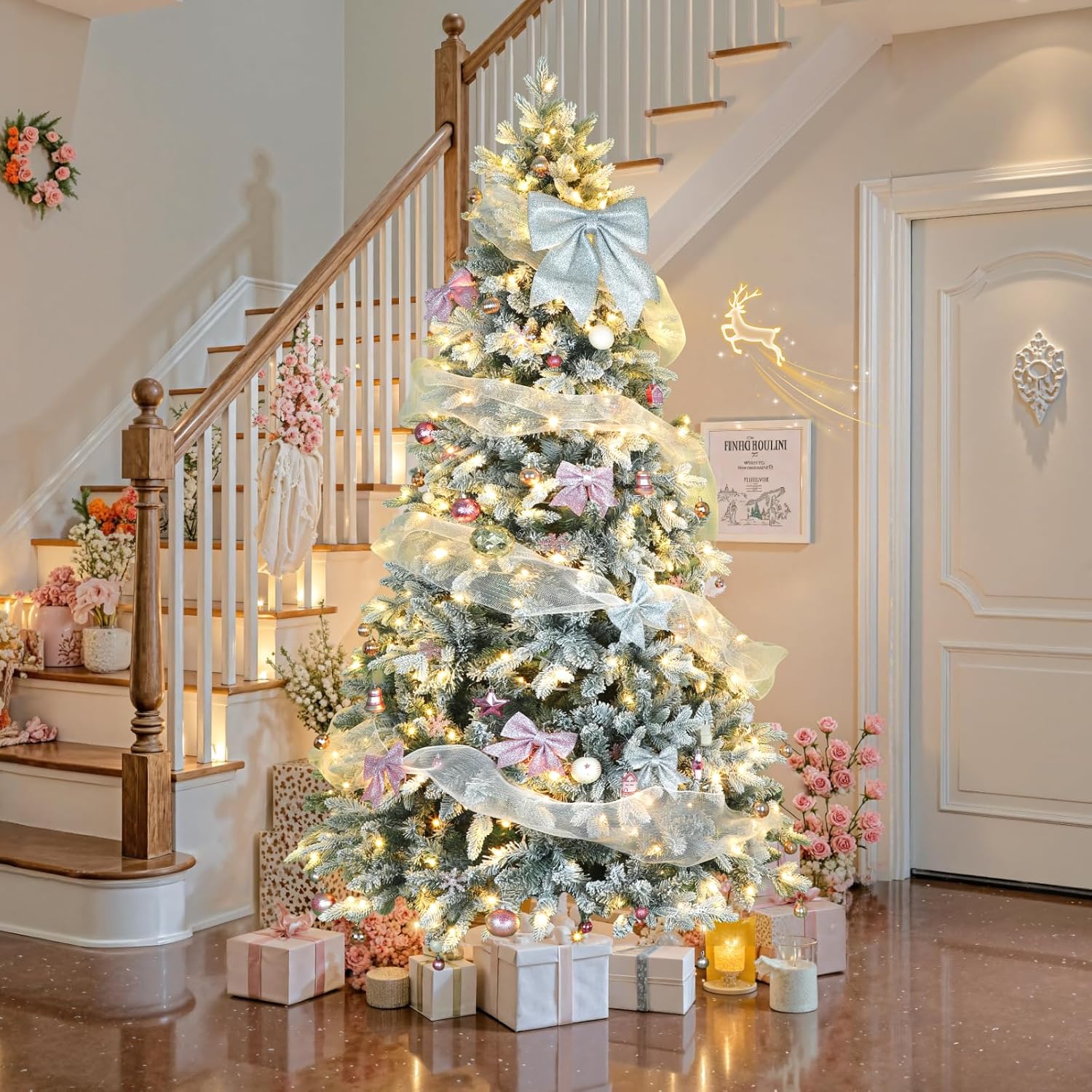 - Realistic Snow Flocked Christmas Tree: The Christmas tree features lush green branches covered in white flocking, creating a stunning snowy white and green appearance that adds a magical winter atmosphere to your holiday decor. Lifelike PVC needles and a natural layered branch design, this tree offers an authentic evergreen appearance without the maintenance.