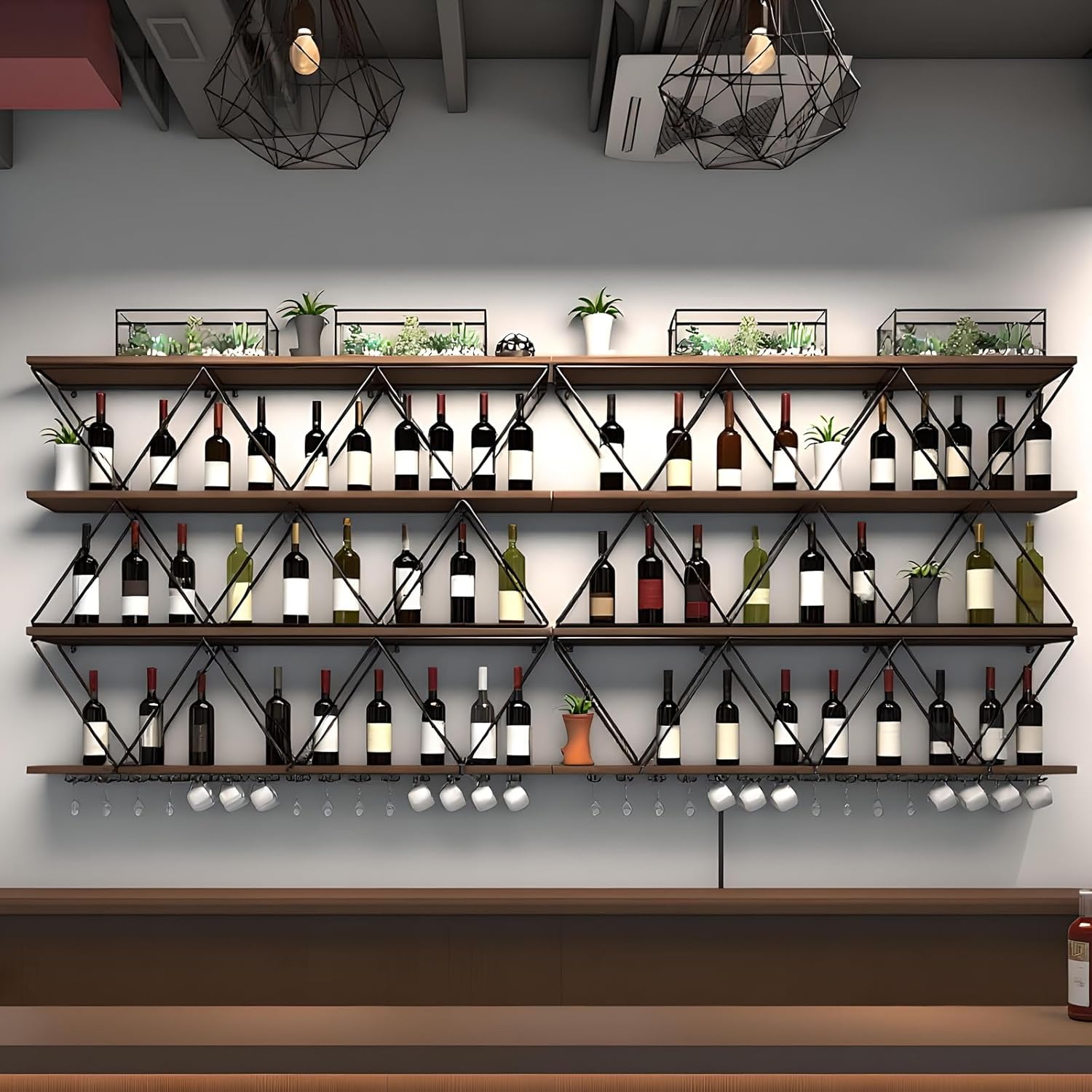 - Multi-function: Well-designed wine glass rack for wine glasses and free placement of wine. This wall-mounted wine rack can not only store wine bottles, but also other items to make your space more sophisticated.