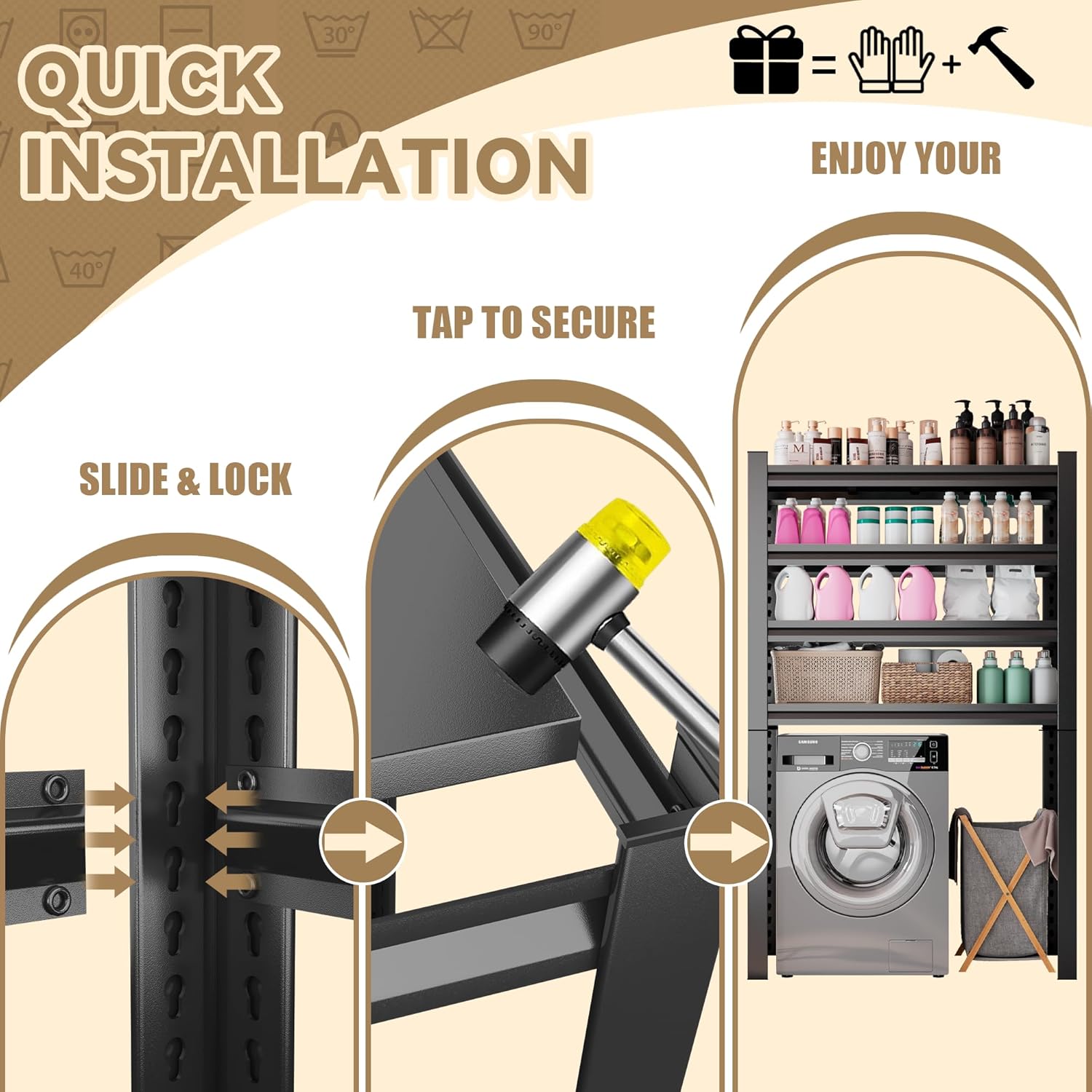 - โ FRUSTRATION-FREE, NO-BOLT ASSEMBLY Get organized in minutes, not hours! This washer dryer shelf features an innovative rivet-lock design that snaps together easily, often without any nuts or bolts. We even include a rubber mallet to make setup a breeze. You'll have this sturdy, free-standing structure assembled and ready to declutter your space long before the next laundry cycle finishes. It's the most user-friendly laundry room shelving units you'll ever own.
