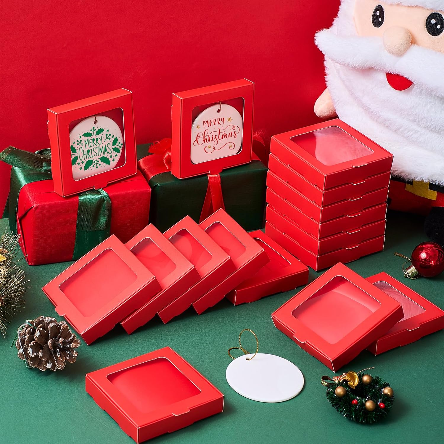 50 Pcs Sublimation Ornament Blanks Box 3.6"x3.6"x0.7" Christmas Ornaments Holder Ceramic Discs Packaging Box with Window for Personalized Xmas Tree Blanks Bulk (Red)