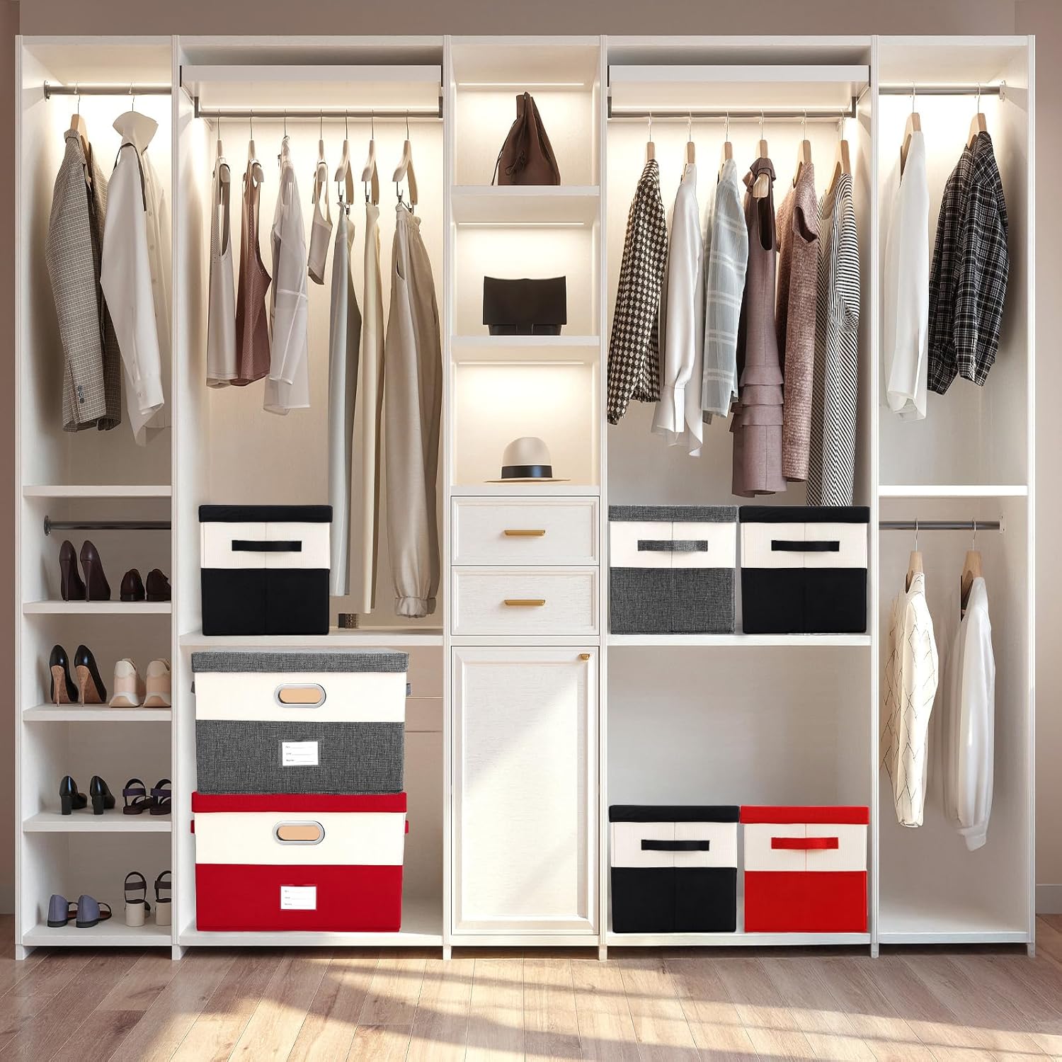 Large Linen Fabric Foldable Storage Bins with Removable Lid and Handles, Washable Storage Box Organizer Containers Baskets Cube with Cover for Bedroom,Office(Red&Cream, Large(2-Pack))