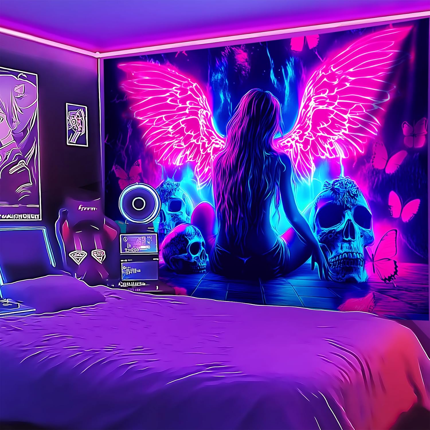 - 【Blacklight/UV Reactive】 Due to the special ink and advanced technology, the blacklight wing tapestry's colors can be changed under Black Light or UV Reactive Light. You can enjoy different effects by kinds of light, the tapestry will be amazing. Under normal light, the colors are also beautiful.