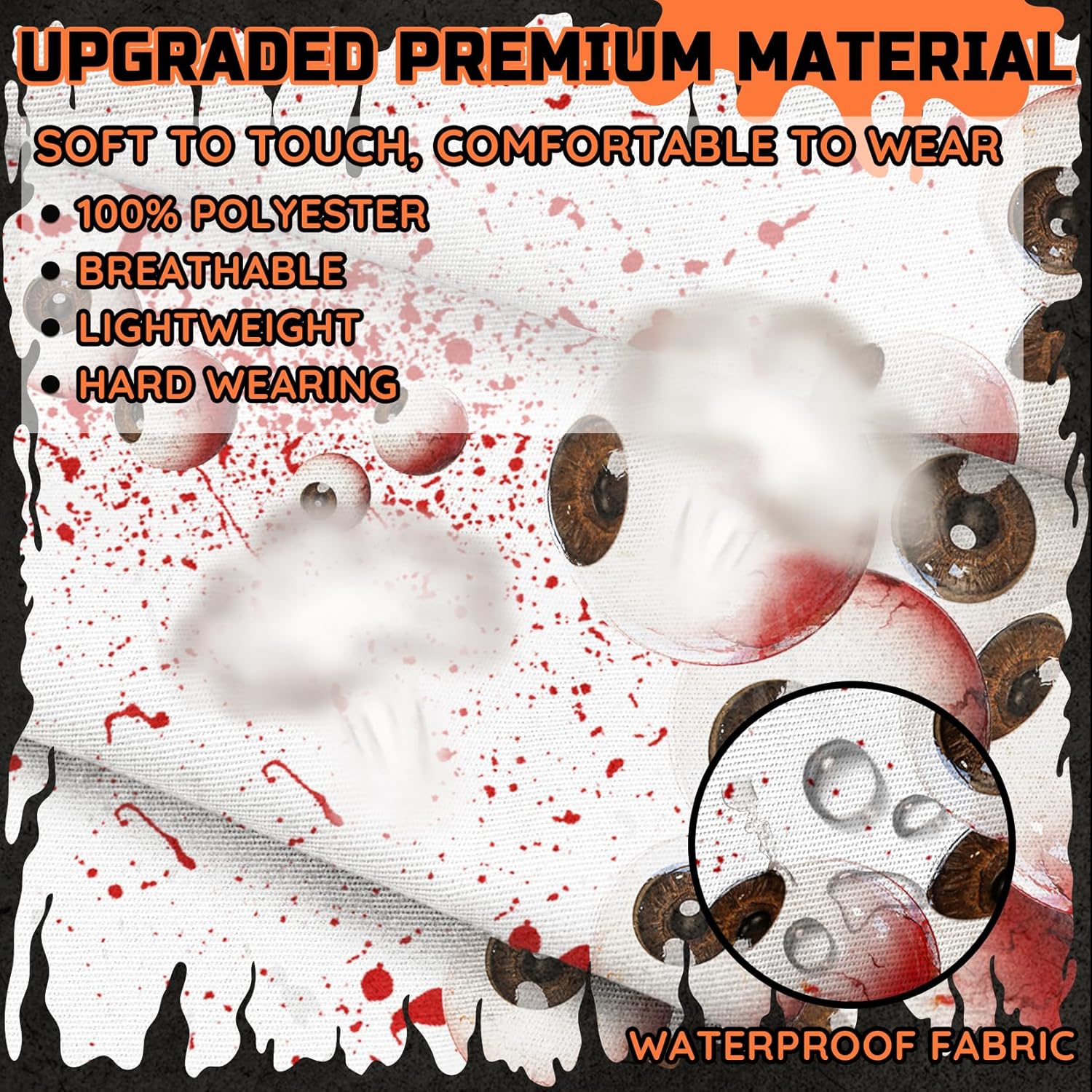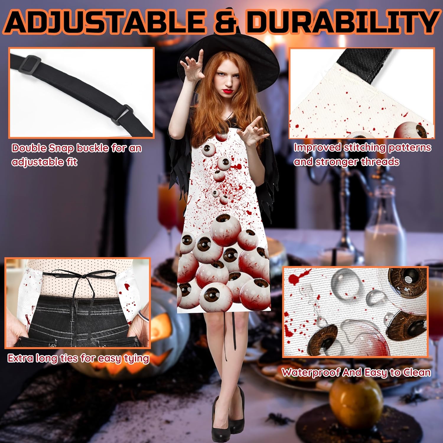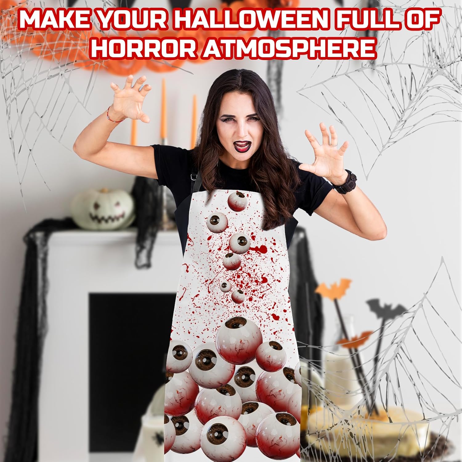 - HALLOWEEN BLOODY APRON : Halloween kitchen aprons feature classic Halloween elements design. Red Blood spatter and realistic eyeballs novelty halloween horror apron, full of horror, joke and funny. Lifelike shape and realistic horror looking. As a scary prop for party, it can really help to create special and memorable moments for you and your friends.
