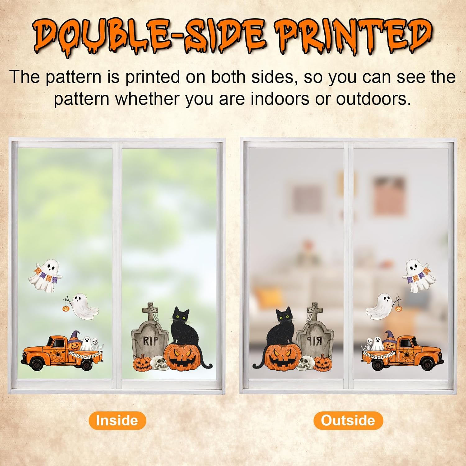 - Double-sided Printed Halloween Window Decals Decor - Our Halloween clings for windows are designed in Double-sided Printed. Whether you're standing inside or outside, you can enjoy the Halloween decorations through the window. Let's celebrate the Halloween party right now!