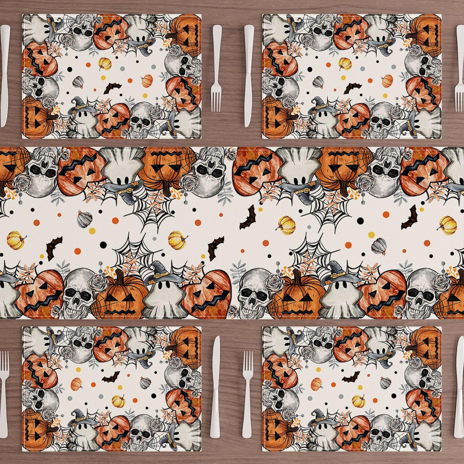 XCHI Spooky Skeleton Ghost Pumpkin Halloween Placemats Set of 6 Table Mats for Party Home Kitchen Dining Table Decorations 12x18 Inch