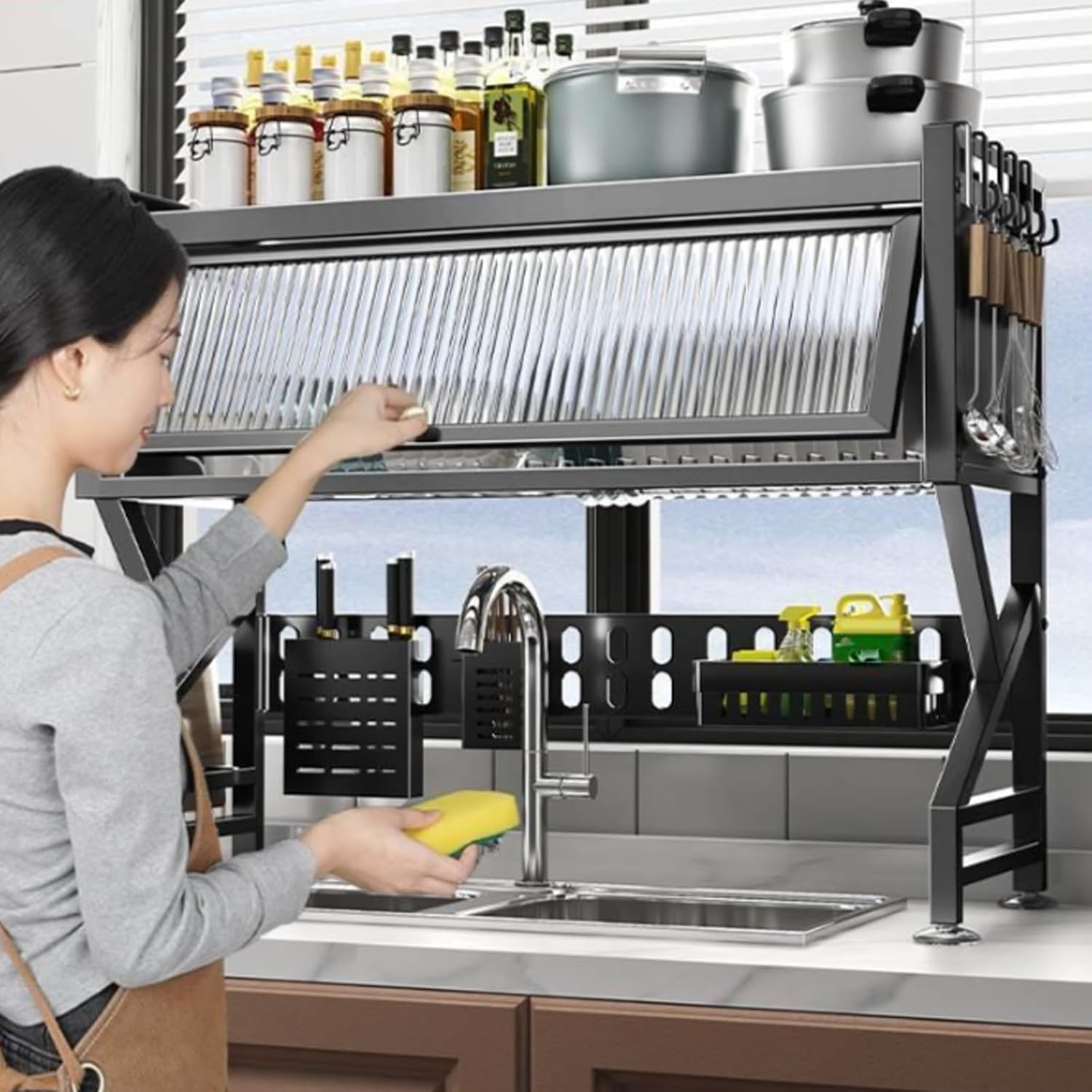 - Innovative Covered Design, Stylish Protection:The utensil dispenser features an exclusive innovative covered design, making this kitchen drying rack for dishes placed over the sink not only provide extra protection for dishes from dust and water stains but also enhance the overall aesthetics of your kitchen with its stylish appearance, keeping your space neat and elegant.