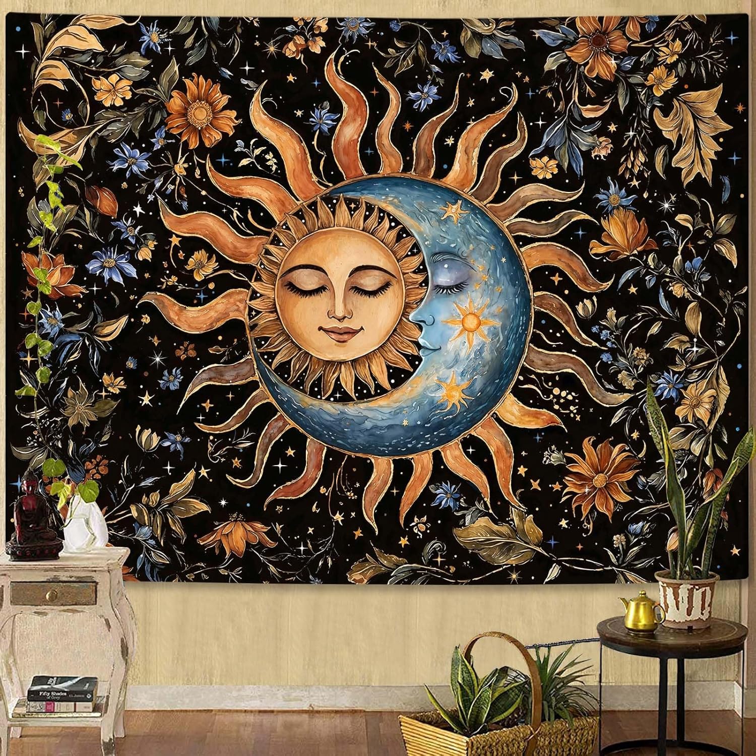 - Unique Sun & Moon Floral Design: Features a captivating scene of a sun and crescent moon with serene faces, surrounded by starry skies and vibrant floral vines, infusing your space with bohemian, celestial charm and a sense of mystical tranquility