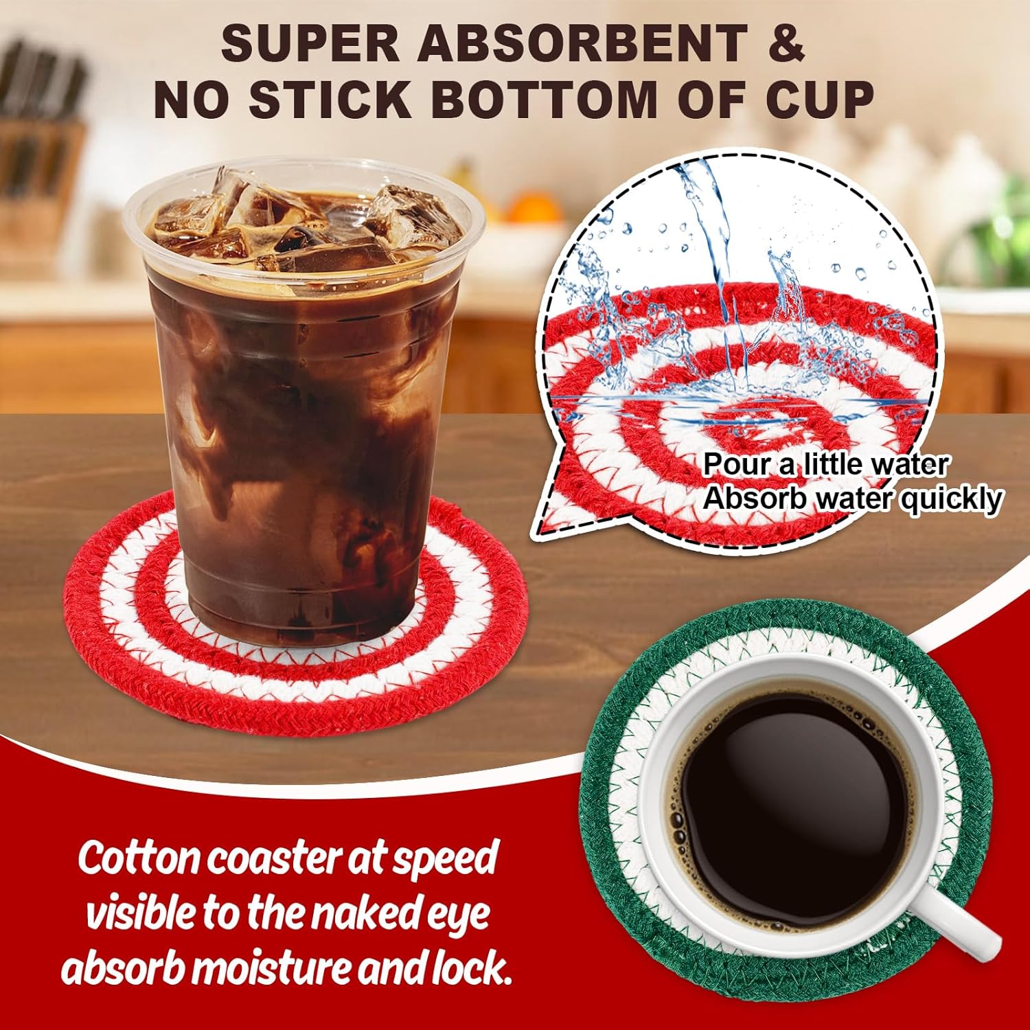 Whaline Christmas Cotton Coasters Red Green Peppermint Candy Handmade Braided Drink Coasters Absorbent Cup Mats for Xmas Holiday Party Home Table Decor, Set of 4