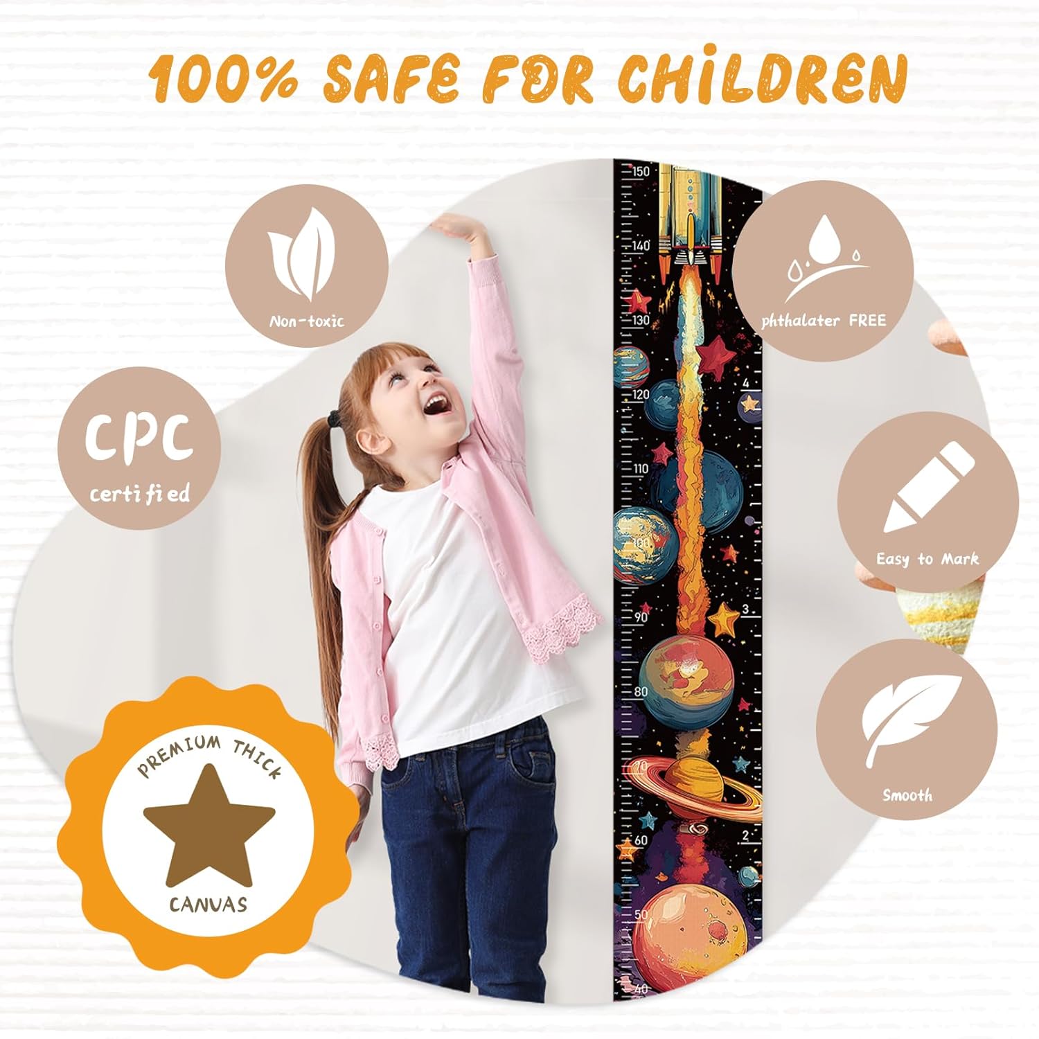 - Canvas Height Chart: Crafted from top-grade, thick, resilient, and waterproof canvas encased in a wooden frame, our kids growth chart for wall guarantees unmatched quality. They are safe, lightweight, foldable, and waterproof.