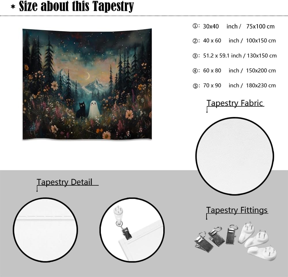 Whimsical Halloween Tapestry Wall Hanging Ghost and Black Cat in Magical Forest Wildflowers Meadow Tapestry Art Print Charming Spooky Fall Season Tapestries for Living Room Bedroom Decor 70x90inch