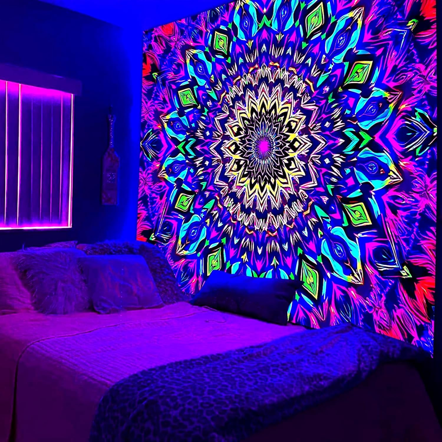 Blacklight Mandala Tapestry for Bedroom, Black Light Posters for Adults and Teens, Colorful UV Reactive Aesthetic Bohemian Wall Art Decor (40 x 30 Inches)